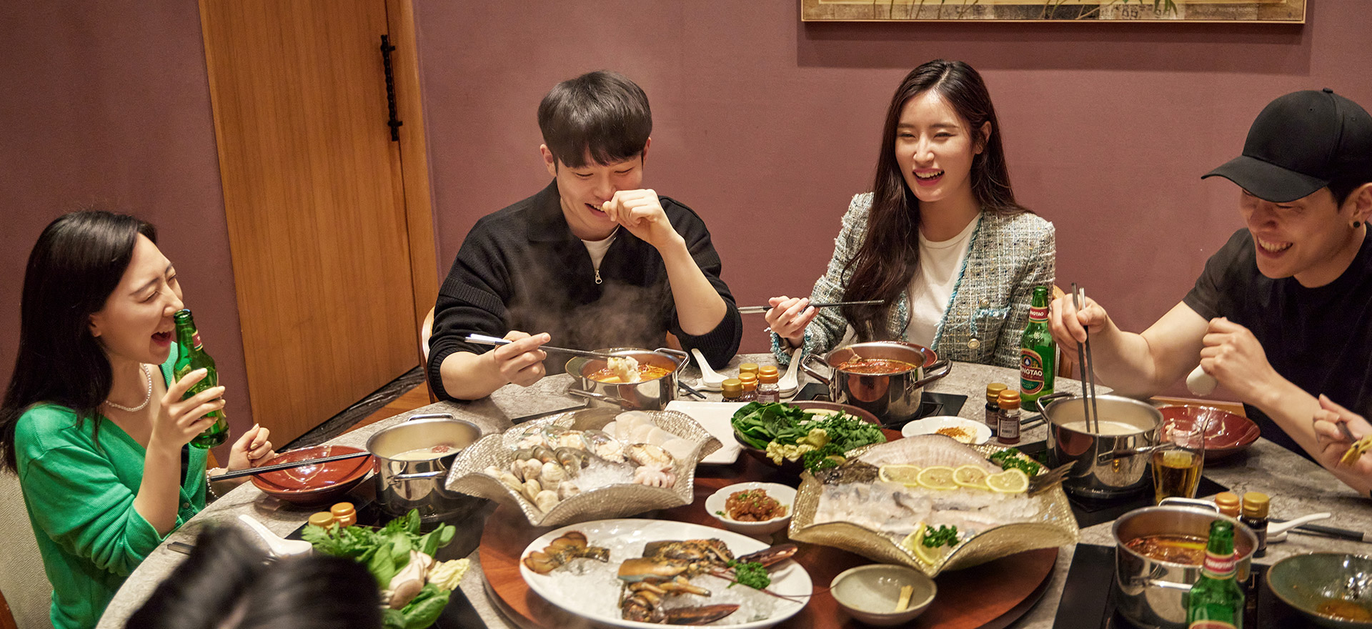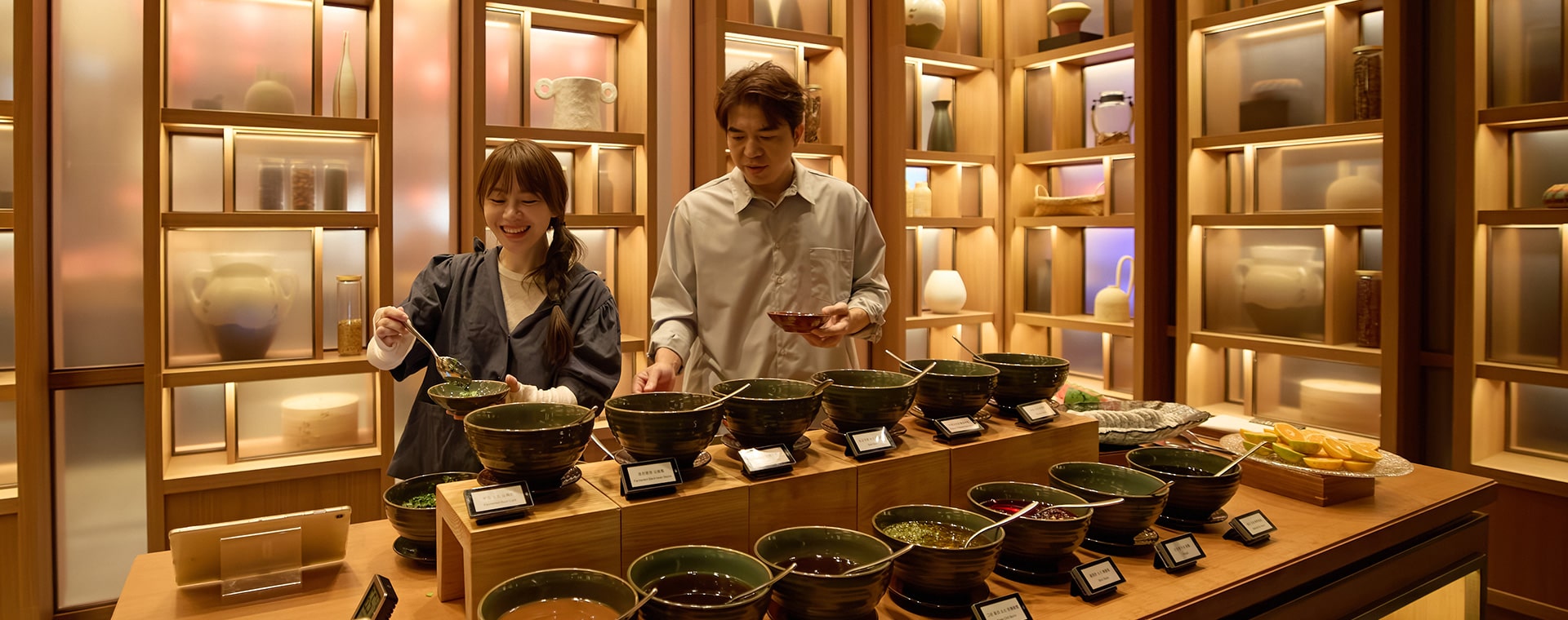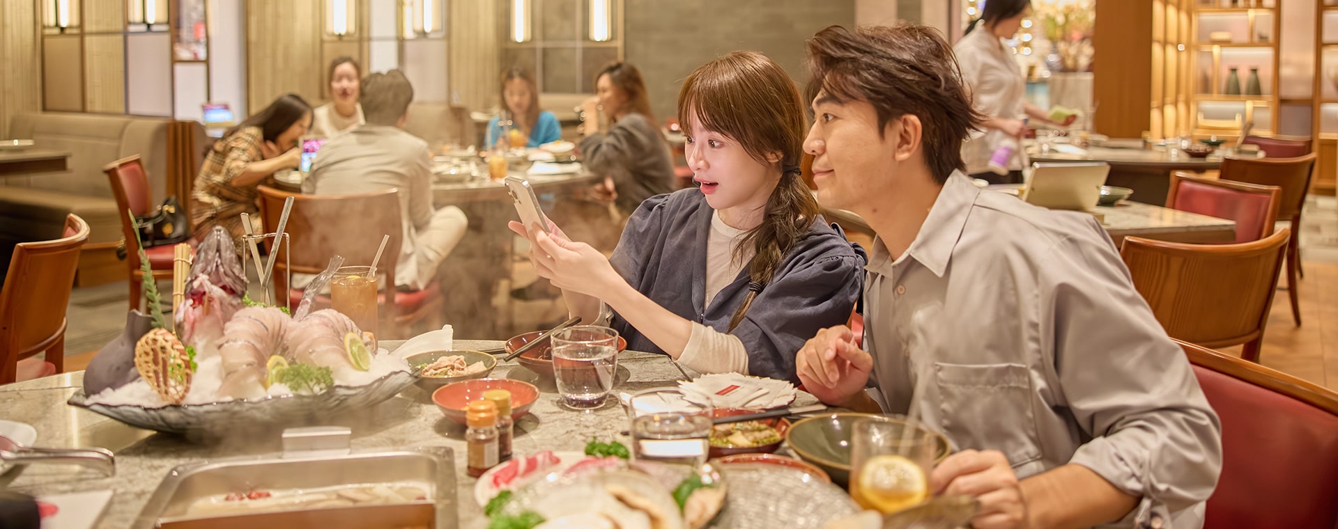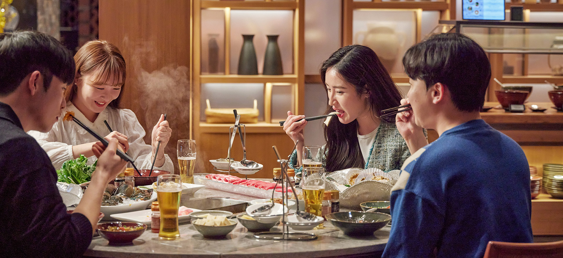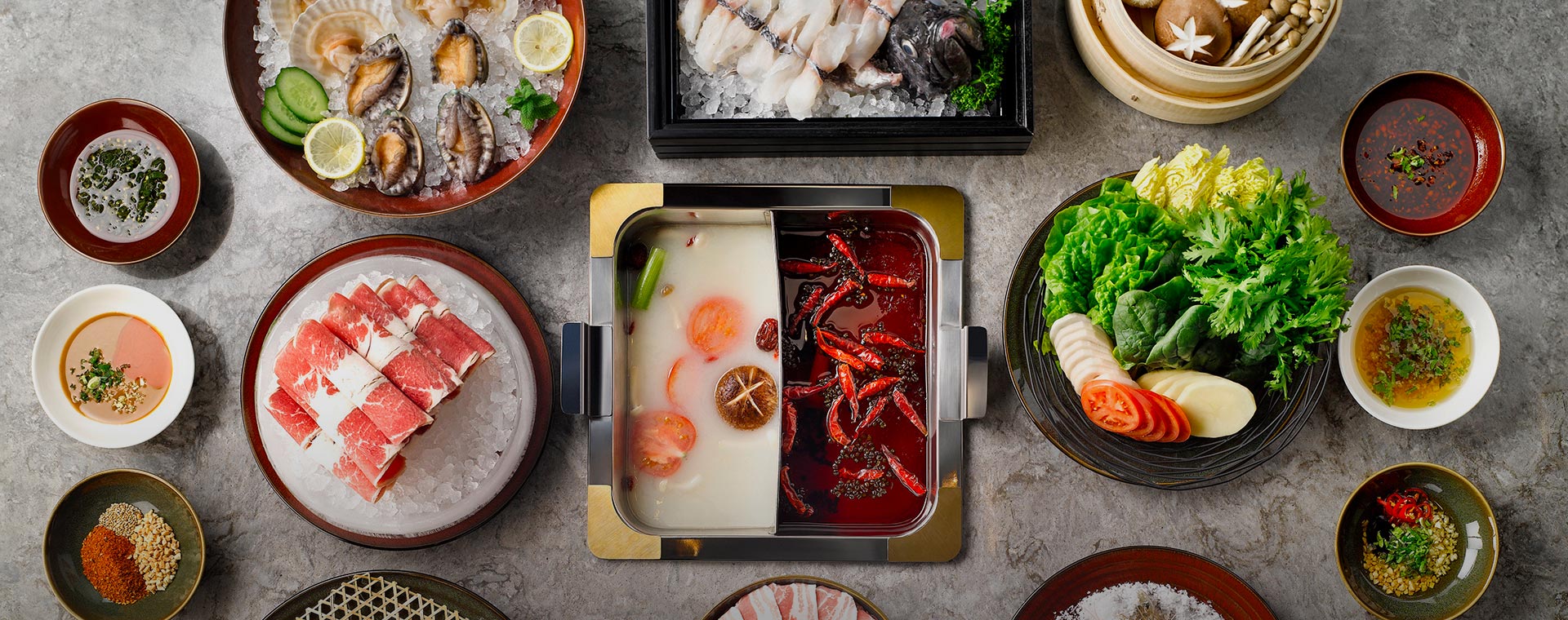 6時間以上煮込んだ濃厚な牛骨出汁に新鮮な具材を入れて食べる、 本格的な高級火鍋をご用意しております。最高級のお肉、新鮮な活魚や 海鮮、種類豊富なキノコ・野菜、肉団子、麺などからお好みで選び、ピリッと 辛い紅湯スープとあっさりとした白湯スープと一緒にお楽しみいただけます。