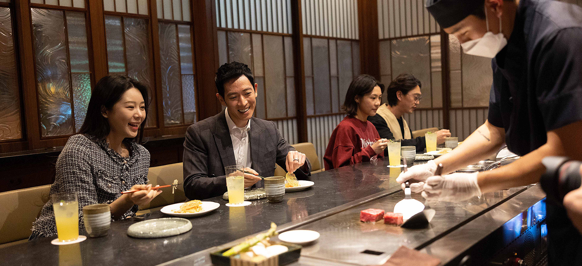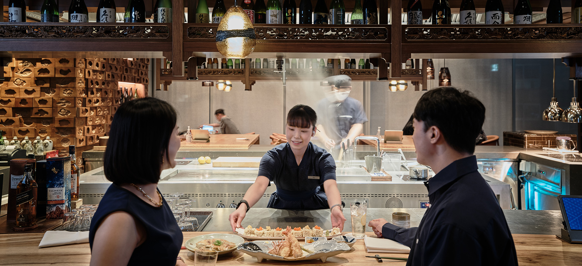 居酒屋、鉄板焼き、寿司を単品からおまかせまで、夢山ですべてお楽しみいただけます。 寿司シェフのパク・ボンジン、鉄板焼きシェフの嘉数 順、居酒屋シェフのチャン・ジンヒョクが、それぞれの専門性を活かし、格調高い日本料理の美学をお届けします。 寿司から済州の食材を使用した独創的な鉄板焼き、そして串焼きや天ぷらなど、お酒との相性抜群な多彩なメニューをご用意しております。 ハイボールや生ビール、プレミアム日本酒、高級ウィスキーなど、豊富なラインナップとともに、夜が更けるまで至福のひとときをお過ごしください。