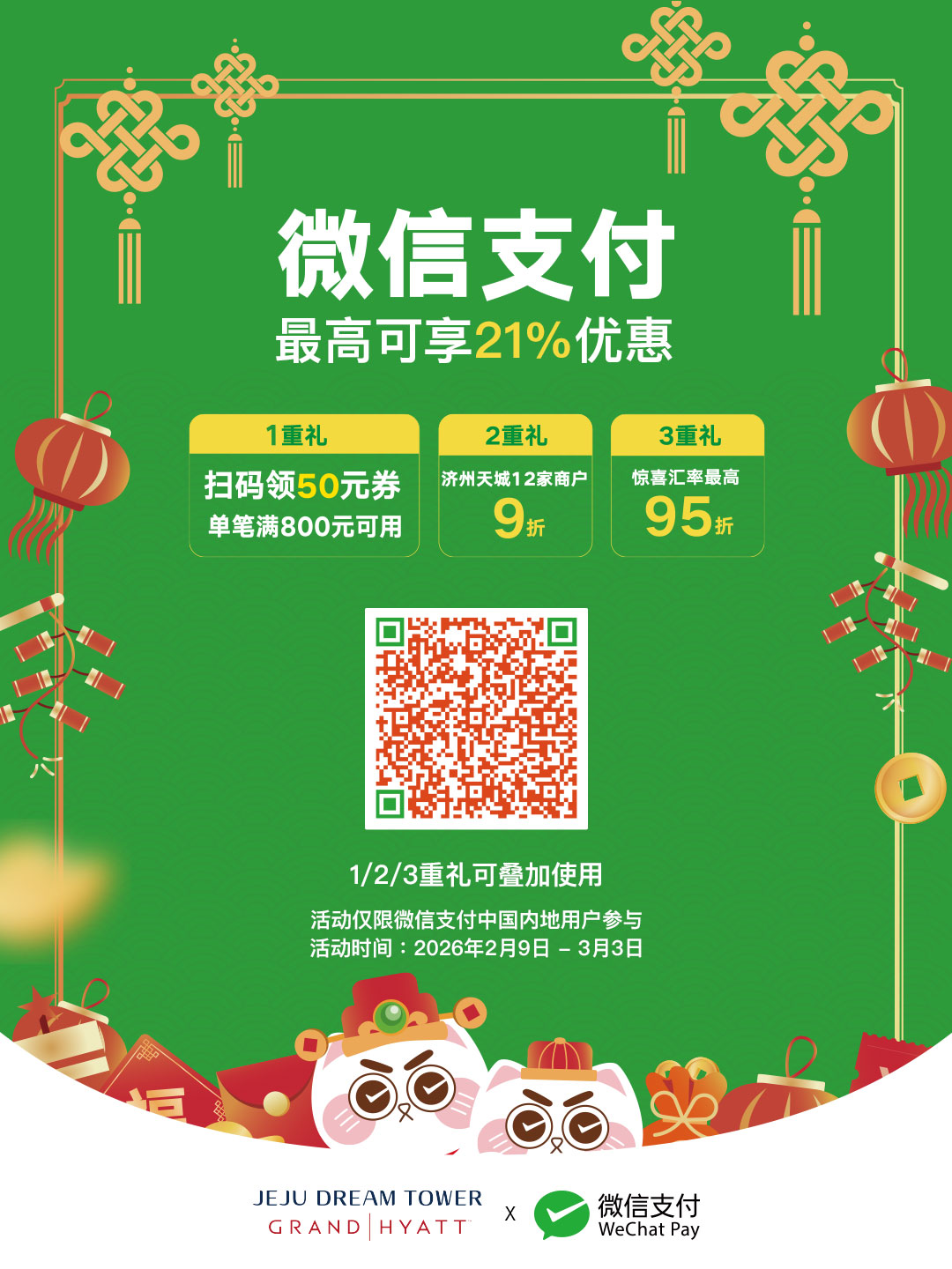 新春佳節之際,濟州君悅酒店攜手微信支付,為您傾情呈獻多重驚喜禮遇, 從美食、購物到身心療癒,一次暢享多重驚喜!